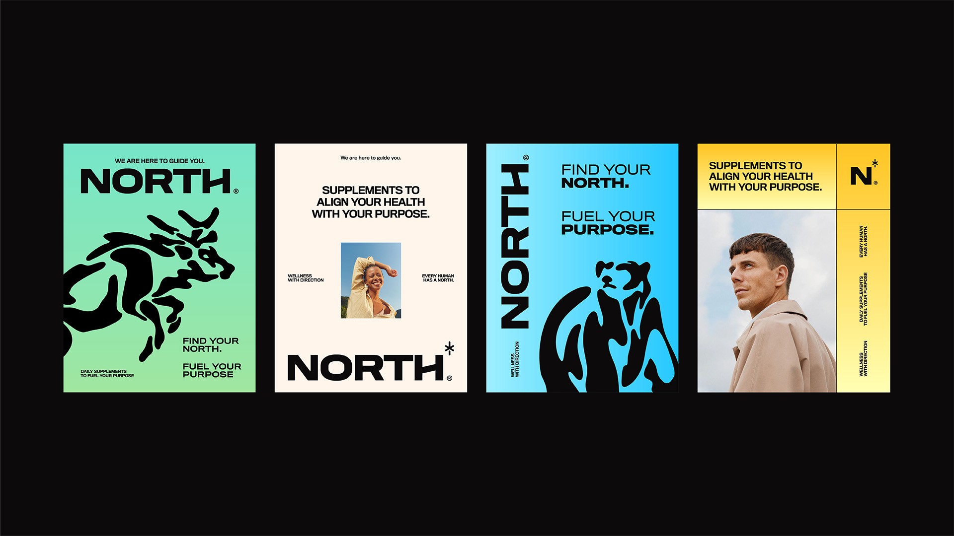 North’s bold, clean aesthetic draws from North Pole elements, while the North Star itself serves as an icon providing a direct visual reference. A palette inspired by Arctic sunrises contrasts neutral tones with radiant gradients, evoking vitality and calm. Illustrated Arctic animals like the polar bear and Svalbard reindeer symbolize strength and balance, differentiating product lines. Packaging feels durable yet elegant, industrial enough for performance users, warm enough for wellness consumers. Metallic finishes and tactile accents reinforce energy, purpose, and premium simplicity connecting through emotion, quality and practicality.