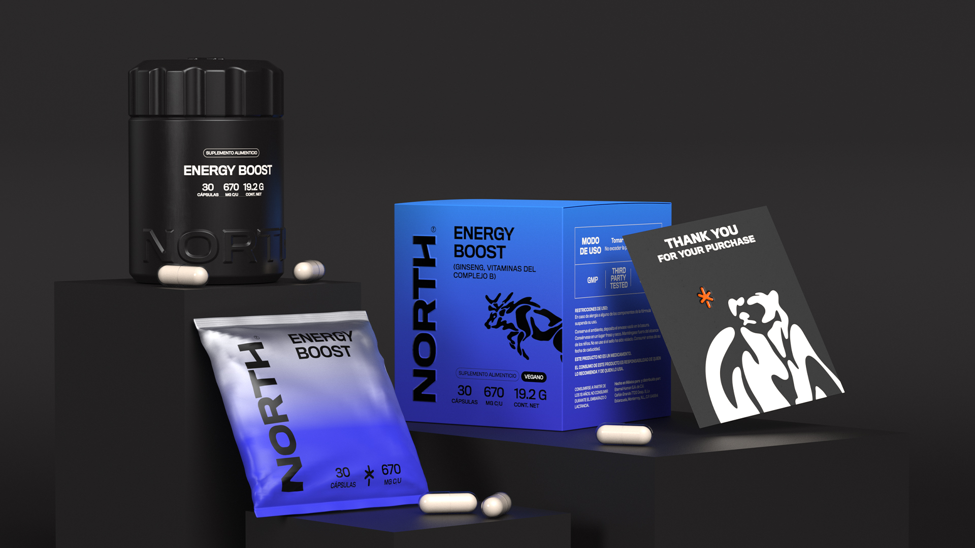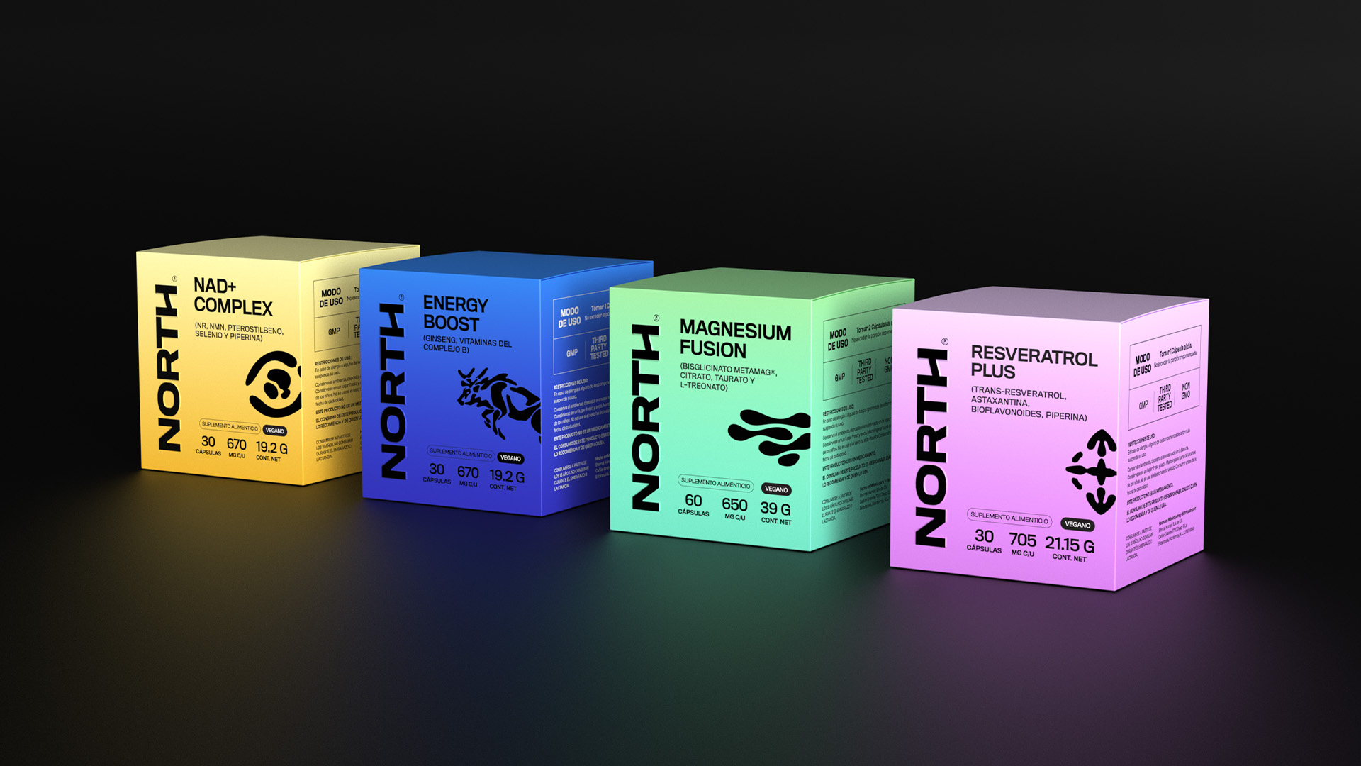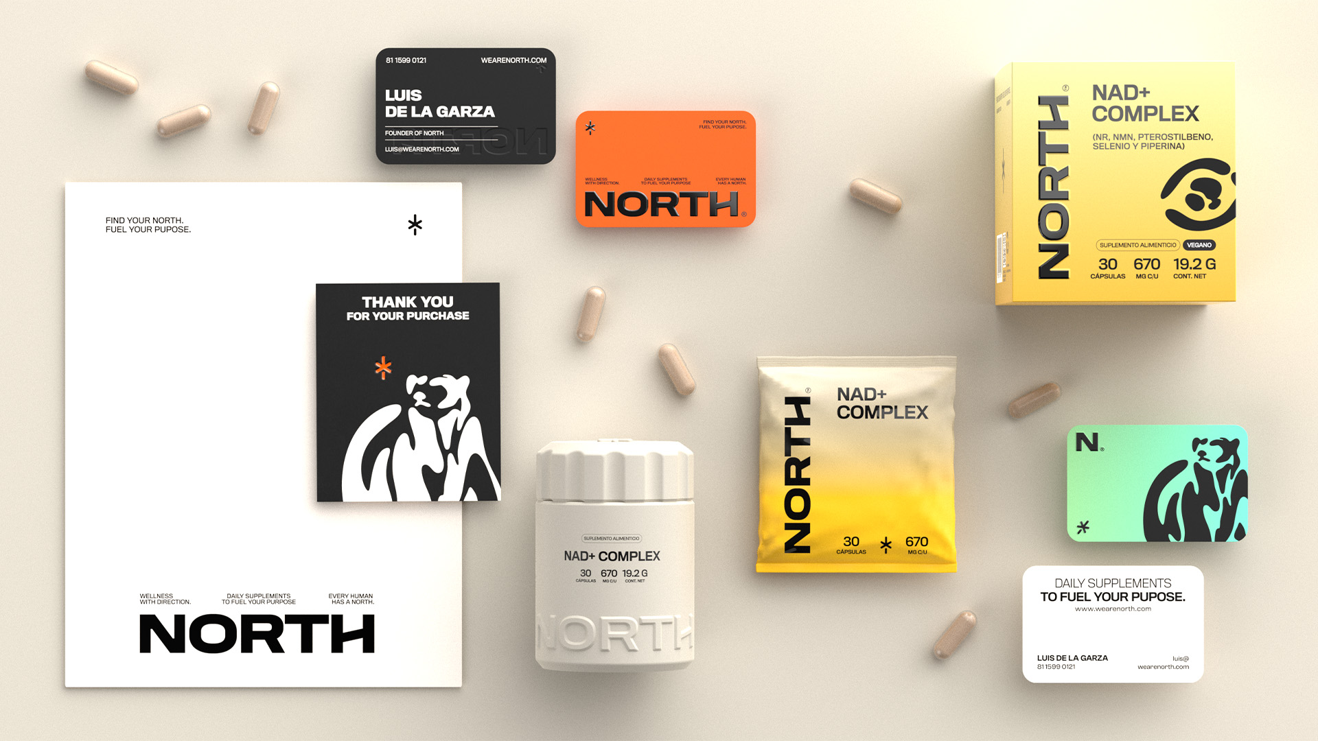North is a Monterrey based wellness brand created to inspire people to find and follow their true north, their source of direction, strength, and purpose. Born from its founder’s personal pursuit of wellbeing, the brand promotes longevity through premium supplements. Its visual identity and packaging merge trust, practicality and vitality, blending Arctic-inspired elements with warm human tones. Honest, bold, and uplifting, North seeks to convey improvement and determination while remaining approachable, inclusive, and environmentally conscious.